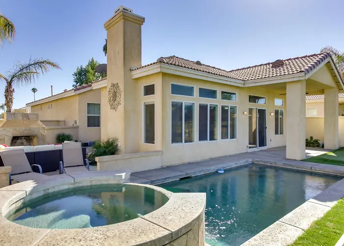 Home On Golf Course With Pool And Spa - 2 Mi To Coachellaはテニスコート、アクアパークと温水プールを提供しています。エンパイア・ポロ・クラブから車で約5分です。 ヴィラには冷暖房、テレビと個別のトイレ付きです。電子レンジ、オーブンと洗濯機も利用できます。
